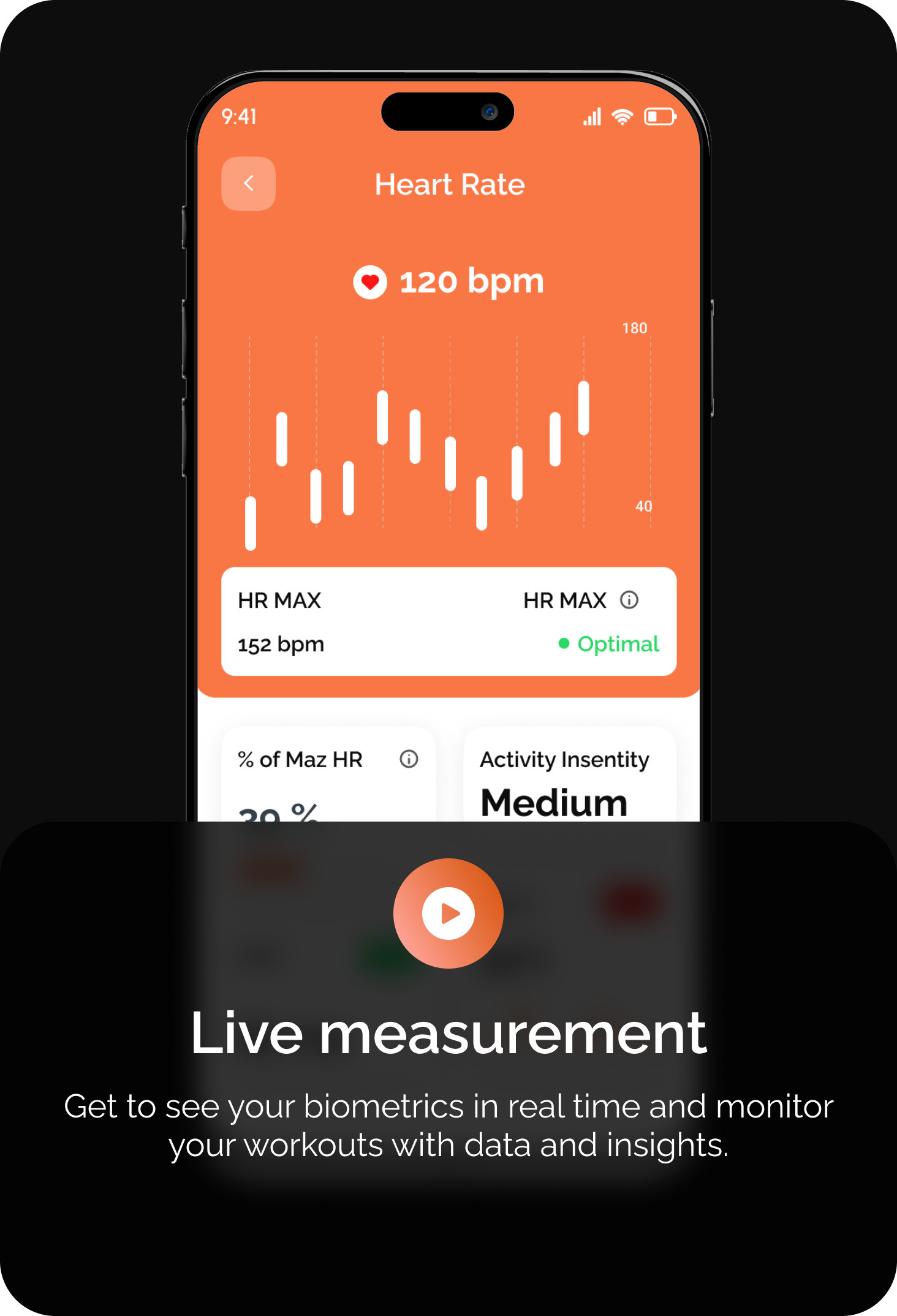 On-demand spot measurement for HR, SpO2, HRV, activity intensities, and Max HR.